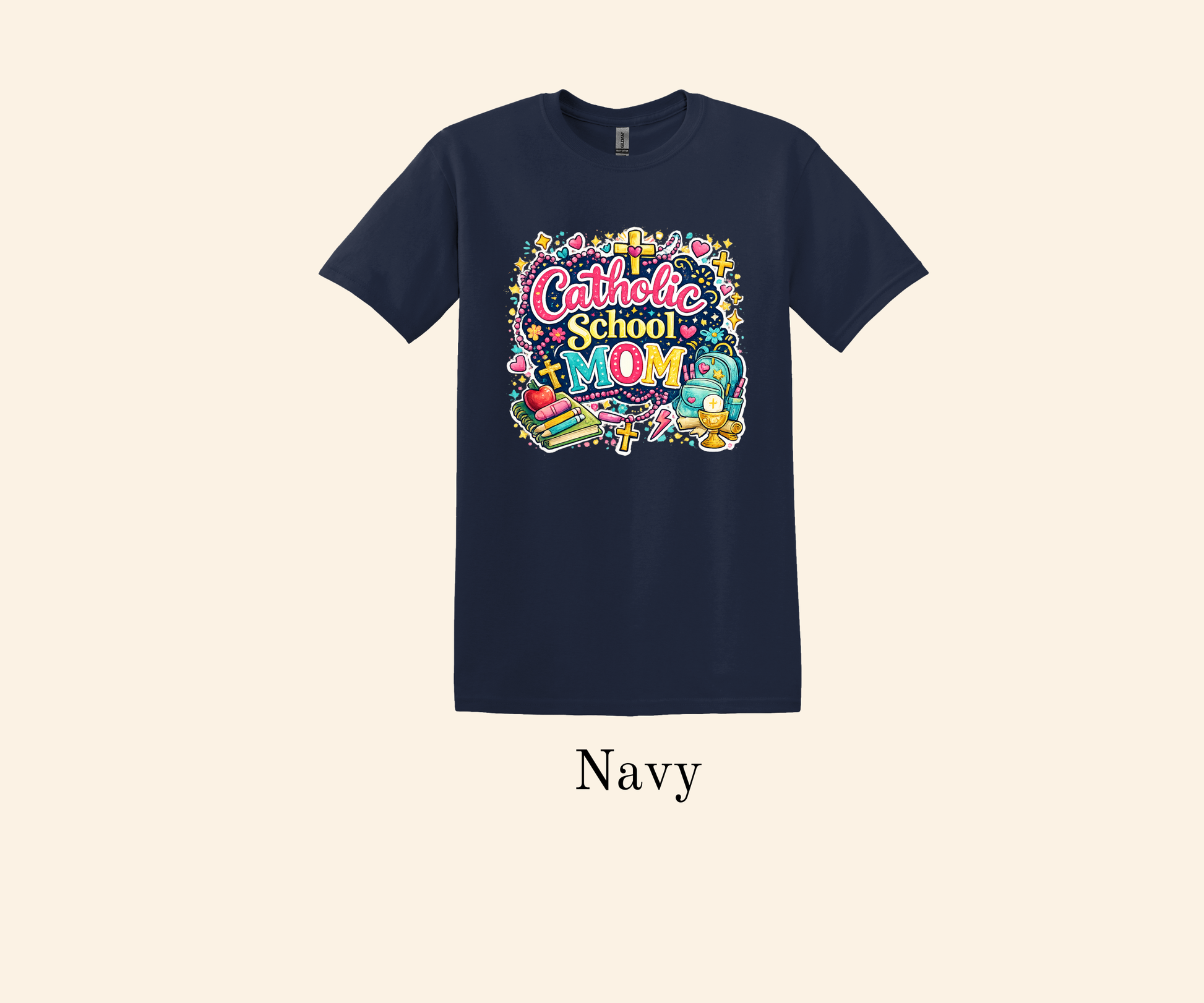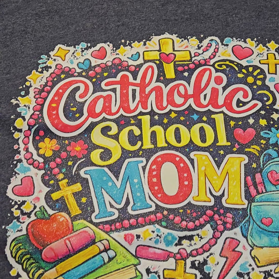 Catholic School Mom life—powered by faith, coffee, and a whole lot of love. This colorful “Catholic School Mom” design is a fun, feel-good tee for drop-off lines, school events, volunteer days, and everyday errands. It also makes a thoughtful gift for your favorite Catholic mama.