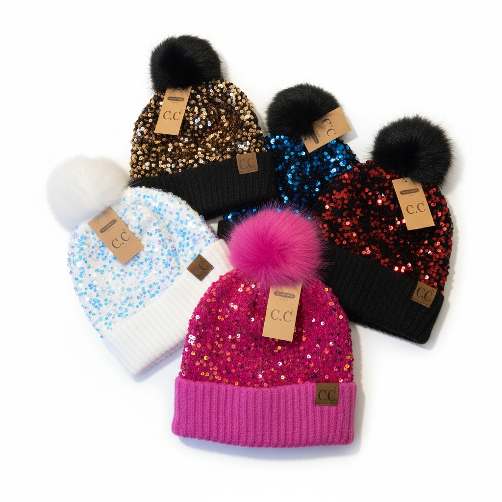 Bring the sparkle to cold weather. These glitter sequin cuff beanies are warm, comfy, and seriously cute—finished with a fluffy faux fur pom pom for that extra “main character” winter vibe.