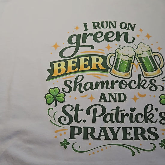 Celebrate St. Patrick’s Day in a shirt that says it all: “I Run on Green Beer, Shamrocks, and St. Patrick’s Prayers.” Perfect for parades, pub crawls, parties, or just showing off your Irish spirit (and sense of humor).